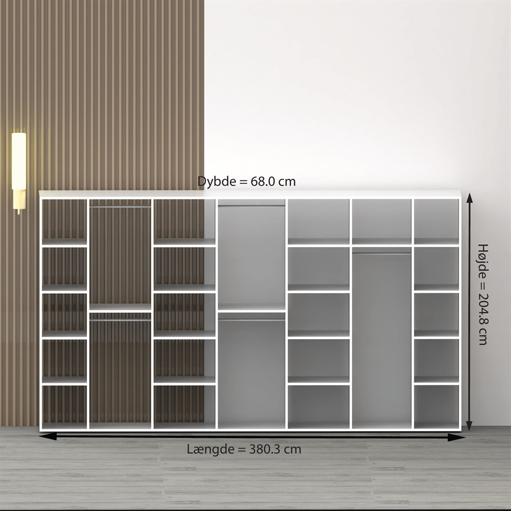 Som standard laver vi dem ikke større end dette garderobeskab. Men hvem behøver også mere? Her er plads til det hele og alle herlighederne dækkes af 3 hvide skydelåger.